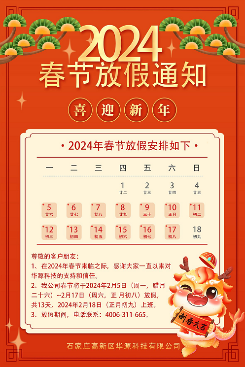 石家莊高新區(qū)華源科技春節(jié)放假通知,公司是石家莊專業(yè)的太陽能、空氣能熱泵服務(wù)商,擁有豐富的行業(yè)經(jīng)驗(yàn)、專業(yè)的技術(shù)服務(wù),熱水洗浴、制冷、采暖系統(tǒng)咨詢定制電話:4006-311-665,華源科技祝大家新年快樂,龍年吉祥!